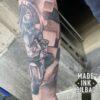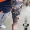 Tatuaje de motos en el antebrazo en realismo negro y gris en homenaje a la gran afición del cliente compartida con su tío.