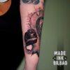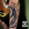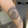 Tatuaje con brújula y mapa de fondo, junto con el tintero y la pluma para completar el diseño. Se trata de un arreglo de un tatuaje ya existente.