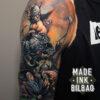 Tatuaje cover de Conan a color en brazo (hombro-codo) con un diseño que representa una escena de guerra en la que se ve a Conan luchando en la batalla.