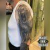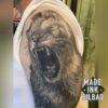 Tatuaje cover en brazo con diseño de un león rugiendo, hecho en realismo negro y gris y con el que conseguimos cubrir totalmente el tatuaje original.