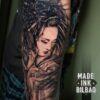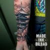 Tatuaje geisha y pagoda: diseño en antebrazo de temática japonesa. En el exterior, una geisha adornada con flores de cerezo y, en el interior, una pagoda.