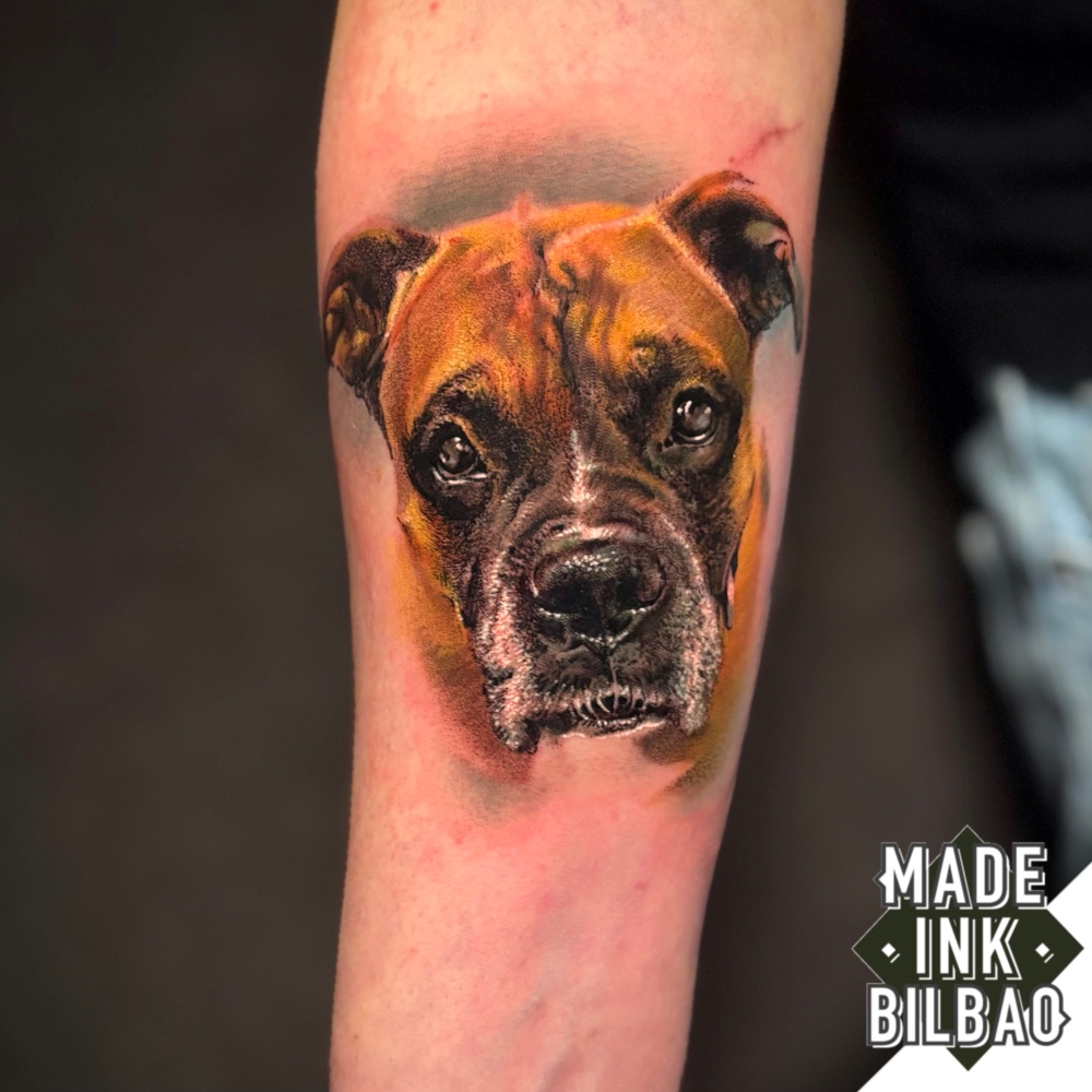 Tatuaje de mascota con el retrato de la perrita boxer del cliente, ubicado en el interior del antebrazo y realizado en estilo pictórico a color.