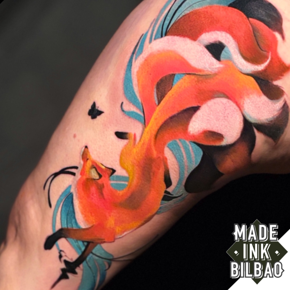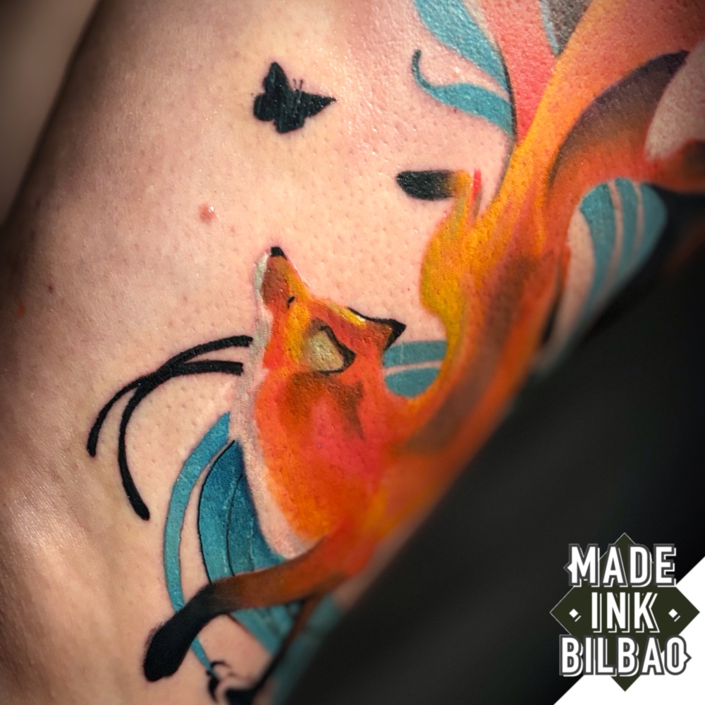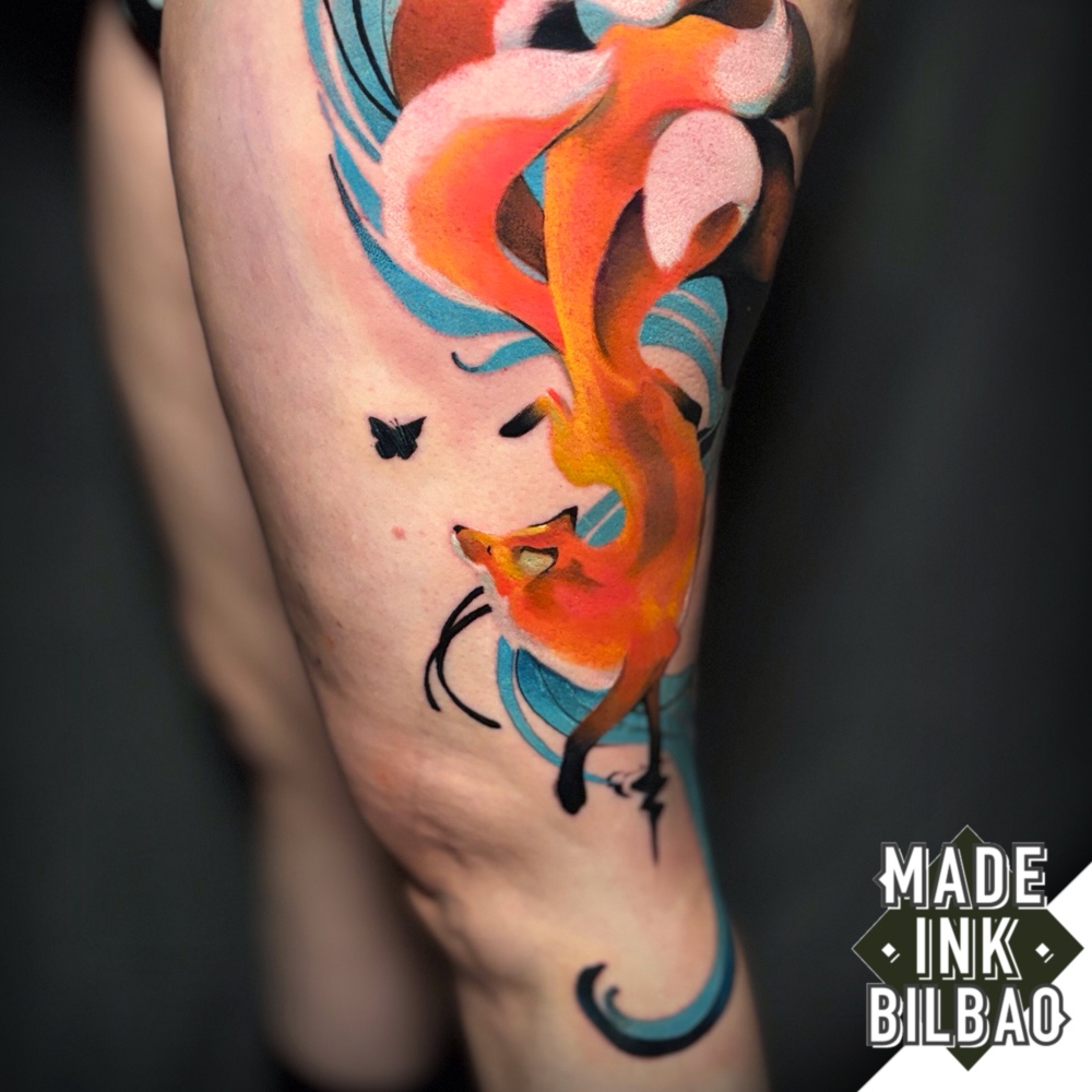 Tatuaje en muslo con diseño de un zorro de nueve colas («kitsune»), figura del folclore japonés que simboliza la sabiduría y la longevidad. Pieza a color.