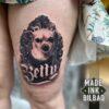 Tatuajes de perras en piernas consistentes en los retratos simétricos en realismo de las dos mascotas de la clienta enmarcados en marcos barrocos.